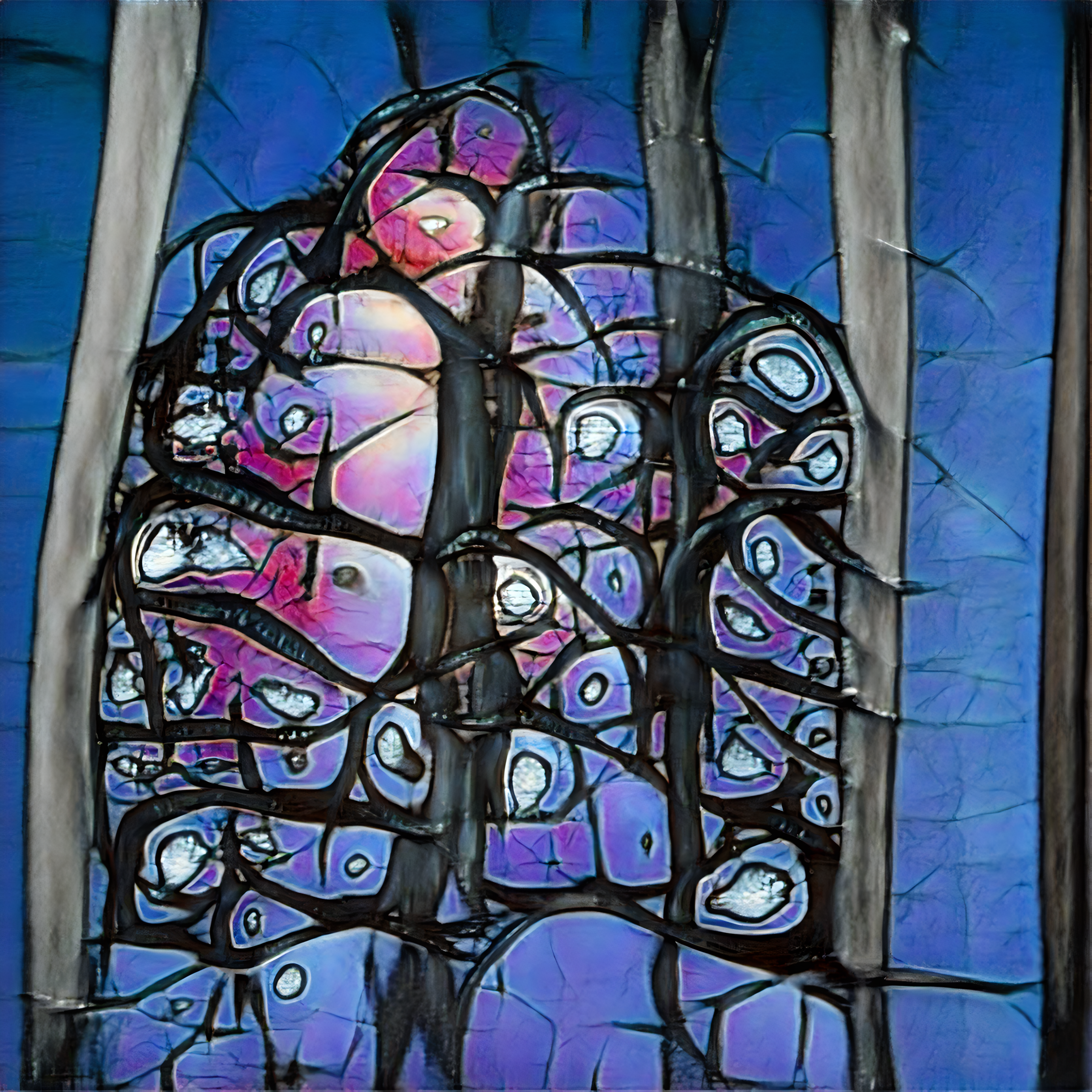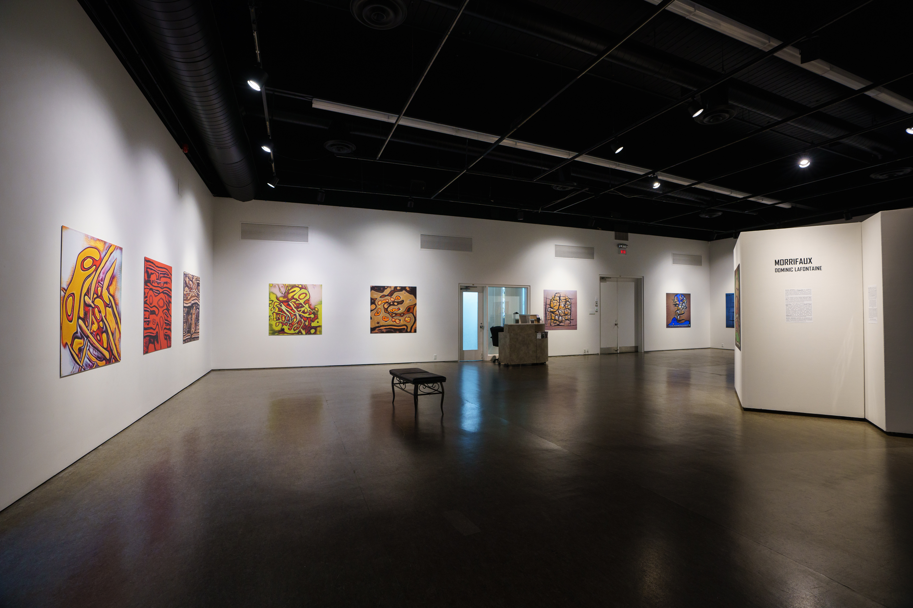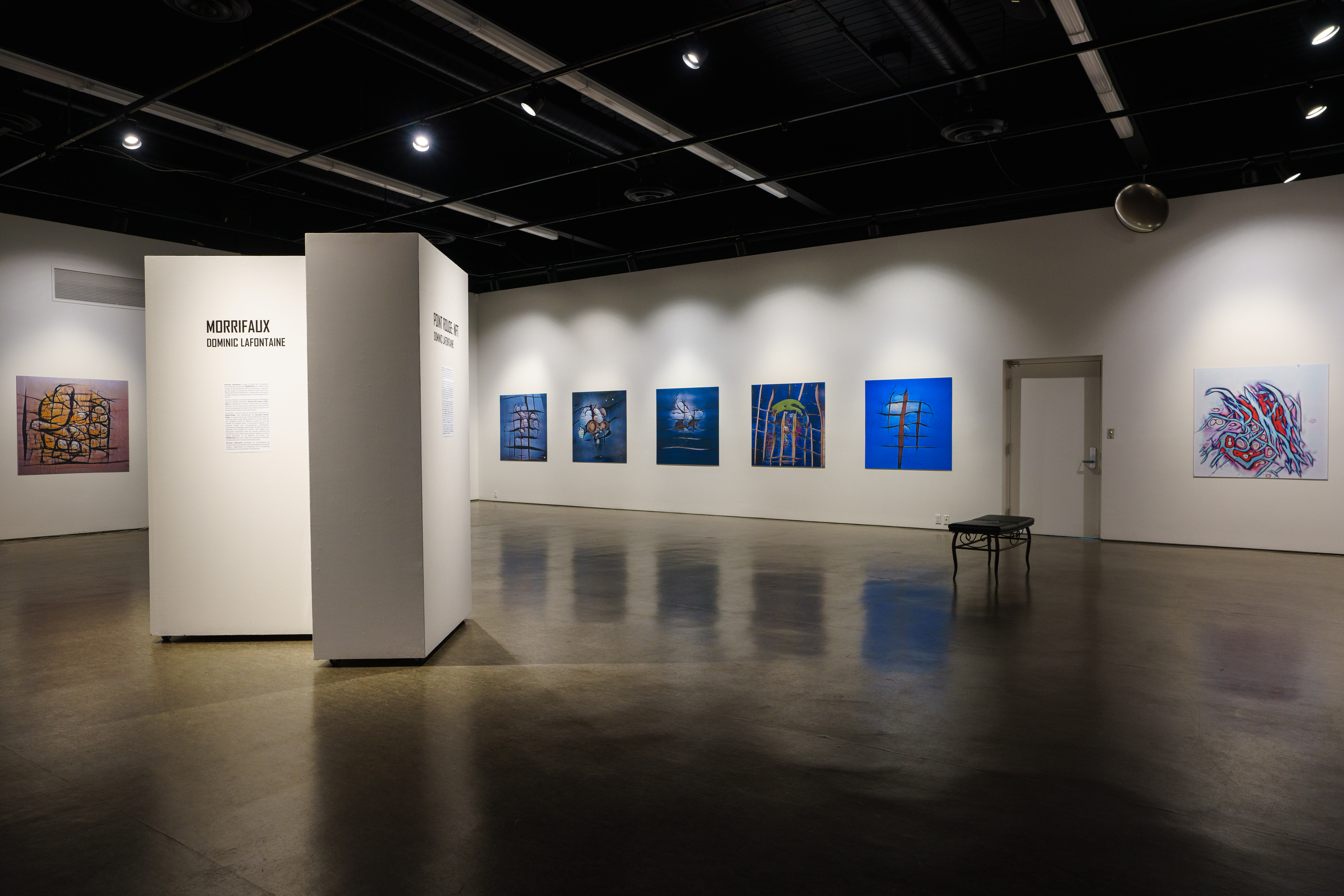 Dans la continuité de synthétise sa connaissance de l’histoire de l’art autochtone avec le langage des nouveaux médias, redéfinissant la substance et le vocabulaire esthétique de l’art Anishinaabek contemporain, Dominic Lafontaine, a créé, les oeuvres MORRIFAUX, à l’aide de l’intelligence artificielle (IA). Les images du style artistique Woodland, générées par des engins numériques, traite de la notion de style et d’identité dans l’art autochtone. MORRIFAUX joue avec l’idée de la paternité numérique, d’itérations et de l’art dans le domaine public. Le choix d’aborder ce style artistique créé par l’artiste Anishinaabek mondialement connu Norval Morisseau, est dû au fait qu’il soit si reconnaissable par les publics autochtone et allochtone. En mars 2023, des policiers ontariens ont mis à jour trois groupes de faussaires, saisissant plus de 1 200 œuvres frauduleuses imitant ce style. Ceci constitue le plus grand scandale touchant le marché de l’art au Canada. Les contrefaçons et les plagiats du travail des artistes autochtones accentuent la vulnérabilité identitaire des cultures si opprimées au cours de l’histoire.